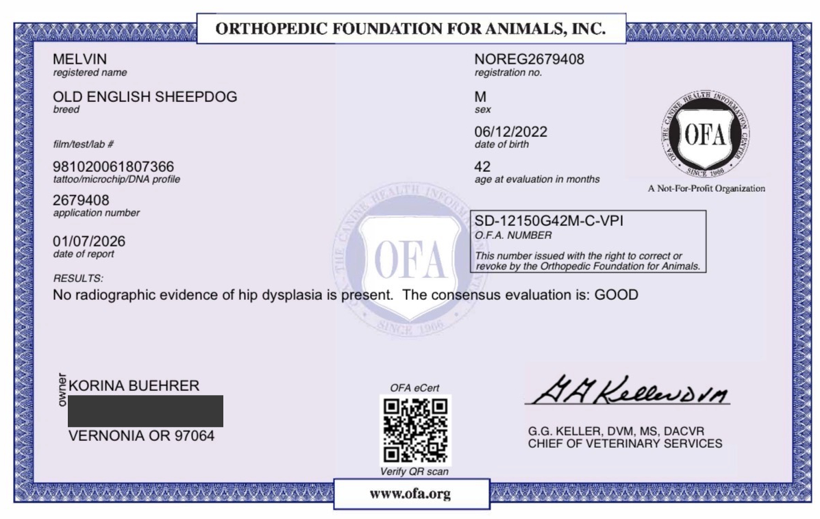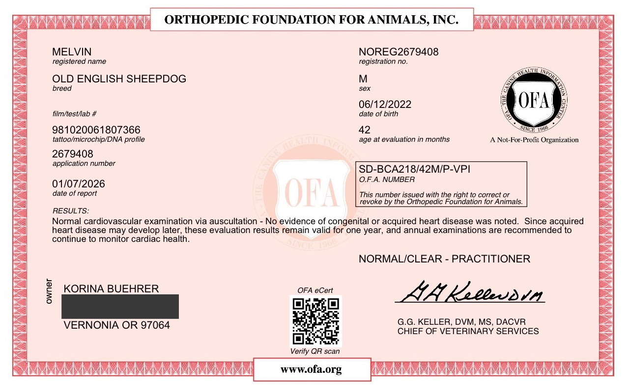 Melvin is an exceptional purebred Old English Sheepdog and an outstanding representative of his breed—sound, stable, and thoughtfully bred from our own lineage. He is the son of the beautiful and well-balanced Sir Watson × River, carrying forward the temperament, structure, and health we value deeply in our program.